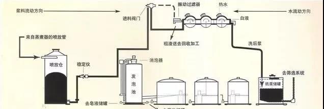 在制浆工艺中,造纸原料经碱法蒸煮后所得废液称为黑液。必须用水洗去其中包含的杂质,才能得到干净的纸浆,然后,用加热浓缩和燃烧的方法回收其中的碱等原料。所以,洗浆的要求应当是用少量水将浆料洗净,如果未将杂质洗净,不但失去了回收这些杂质的机会,还会使后面工序的起泡问题加重。连续化生产中,前后工序限制了洗浆的时间,因此,洗浆速度需要较快地进行,然而,严重的起泡却直接干扰和破坏了对洗浆提出的这些要求。
